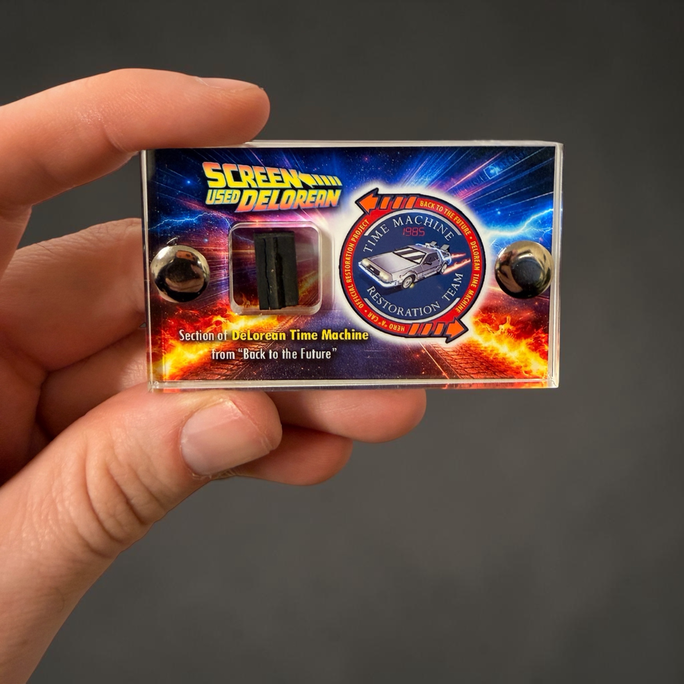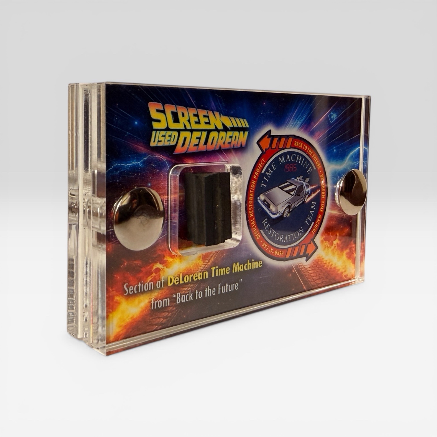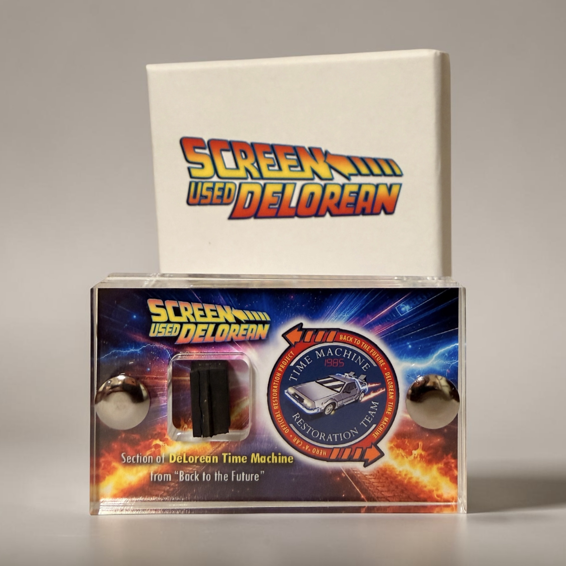 This awesome mini display contains a section of the screen-used DeLorean Time Machine, back in 2012 Joe Walser was a Project / Team Leader in restoring one of the original DeLorean Time Machines from Back to the Future films and The Movie Reliquary are proud to announce we have teamed up with Joe to offer sections of the Screen Used DeLorean in our mini displays with a custom box logo art and presentation baring the Restoration Teams logo on our display. Sections that needed to be repaired and couldn’t be used have now made their way to movie Reliquary HQ and this is the first of a very limited run we are offering.