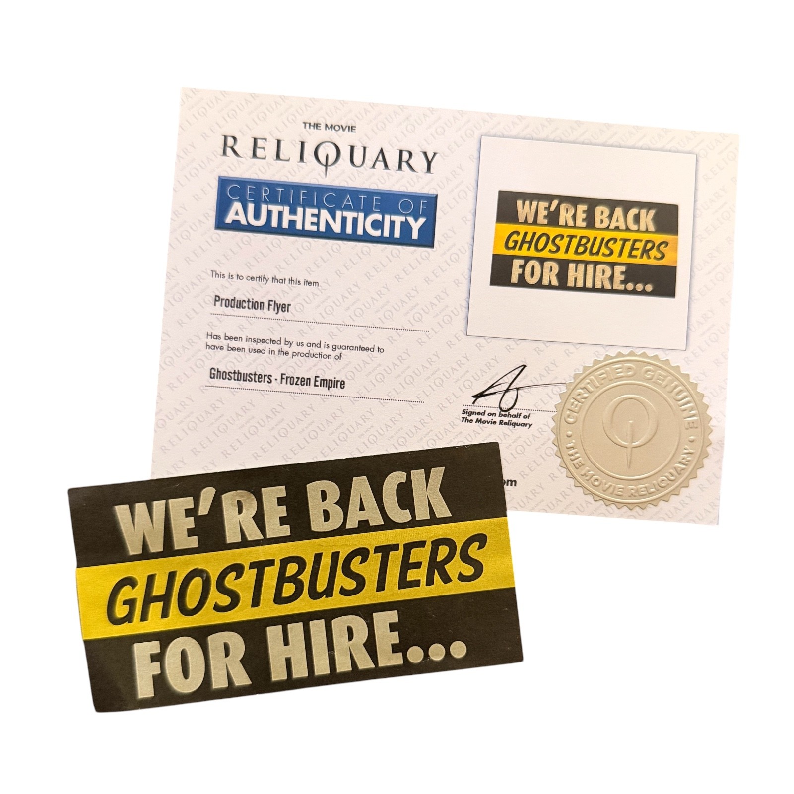 A production used flyer from the ghostbusters recent film, Ghostbusters Frozen Empire measures 110mm x 157mm comes complete The Movie Reliquary Certificate of Authenticity